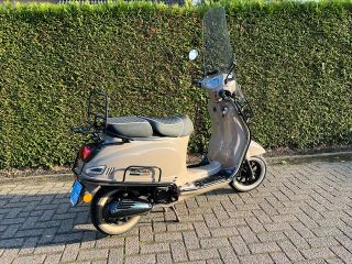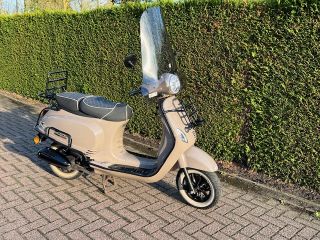Deze scooter is voorzien van o.a. hoog windscherm, white whall banden en een zwarte valbeugelset.